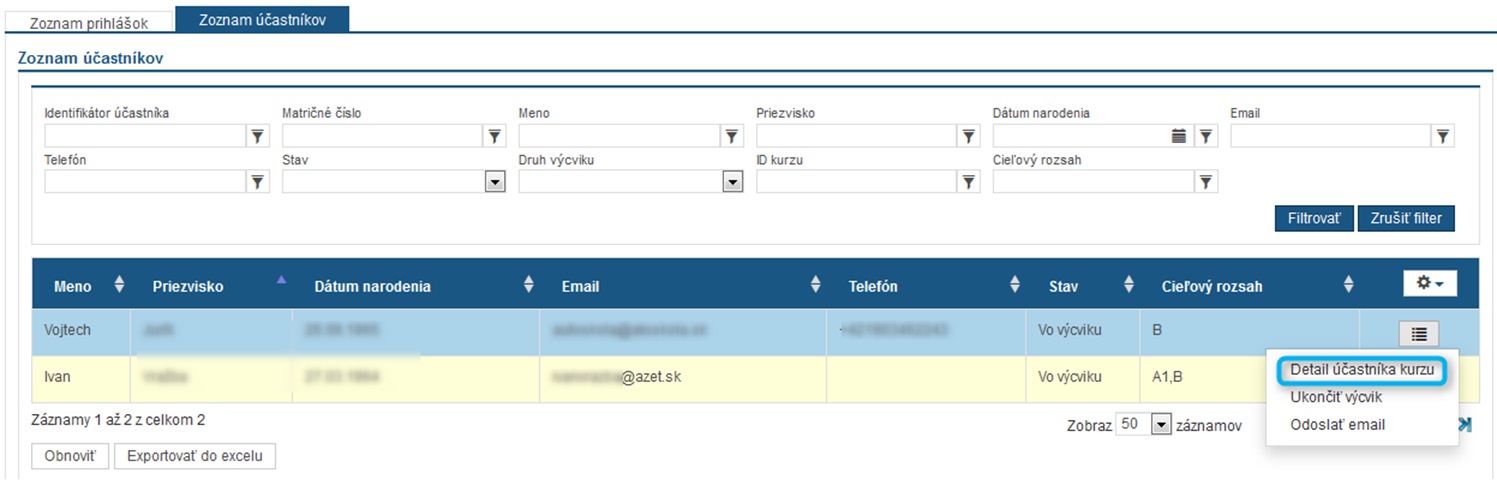 Na obrazovke Detail kurzu je možné zobraziť si cez akciu Detail účastníka kurzu
