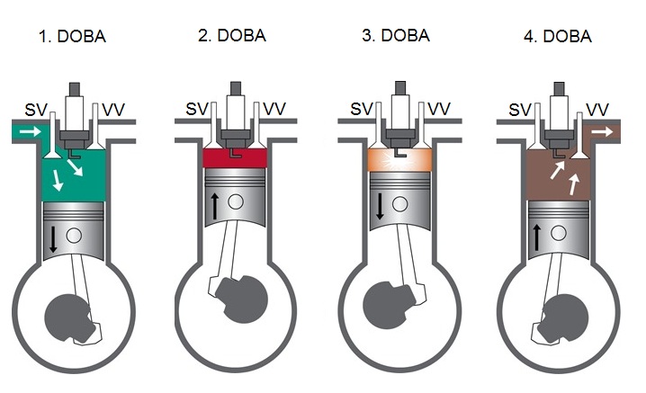Pracovná činnosť je na štyri doby, tzn. 4 zdvihy piesta a jeden úplný pracovný cyklus prebehne počas dvoch otáčok kľukového hriadeľa – uhol kľuky je 720º.