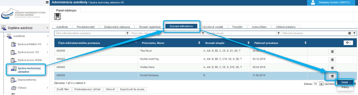 Následne v záložke „Zoznam inštruktorov“ si zvolíme v riadku konkrétneho inštruktora „Zoznam akcií“, a kde vyberieme možnosť „Detail“.