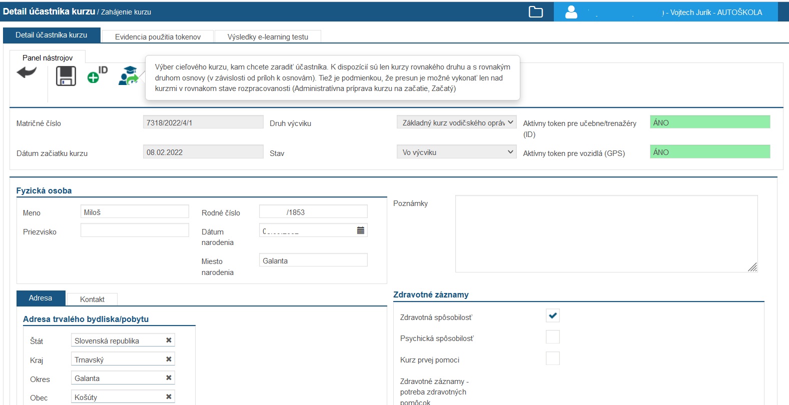 Presun vykonávame z detailu účastníka kurzu kliknutím na „Presun účastníka kurzu“.
