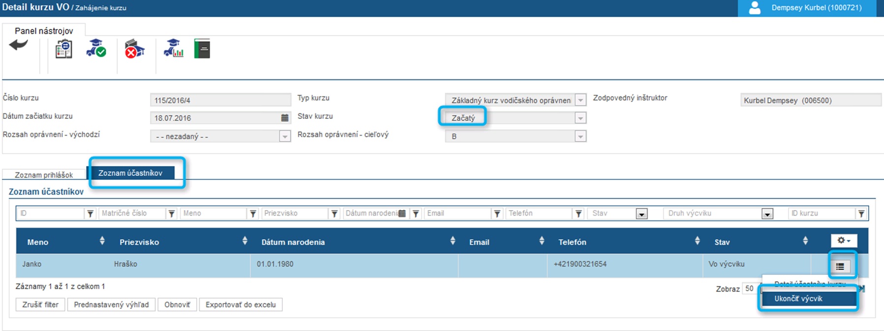 Potom, čo účastník splní minimálne podmienky podľa osnovy je možné ukončiť jeho výcvik. To sa vykoná tak, že v „Detaile kurzu“ v záložke „Zoznam účastníkov“ (zobrazuje sa automaticky od administratívnej prípravy kurzu) sa vyberie účastník na ukončenie