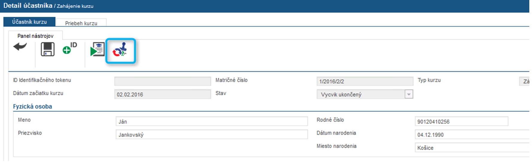 Súčasťou ukončenia výcviku je možnosť vygenerovať zo systému „Osvedčenie o absolvovaní kurzu“. Táto možnosť je dostupná v „Detail účastníka“ - v paneli nástrojov akcia „Generovanie osvedčenia“.