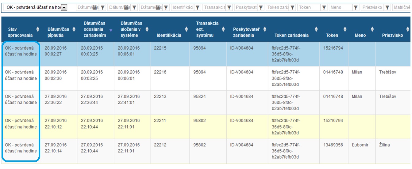 Môžete to realizovať vyfiltrovaním účastníka a následne prezretím časov a jeho pípnutí a v prípade problému uvidíte v stĺpci Stav spracovania v čom nastal problém.