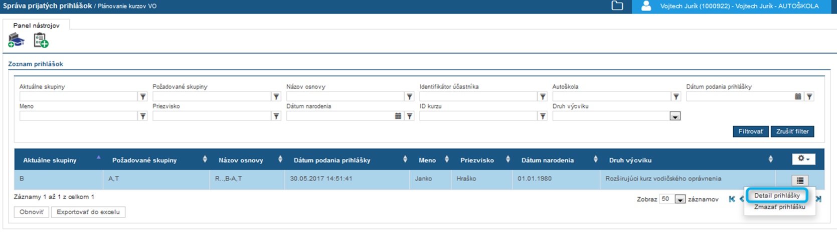 Na obrazovke Prehľad prihlášok je pre každú prihlášku dostupný Zoznam akcií s akciami „Detail prihlášky“„Zmazať prihlášku“.