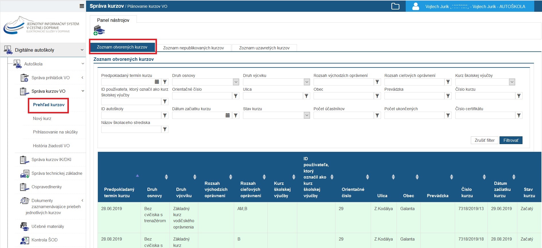 „Zoznam otvorených kurzov“ so základnými údajmi o kurzoch, konkrétne o kurzoch v stave